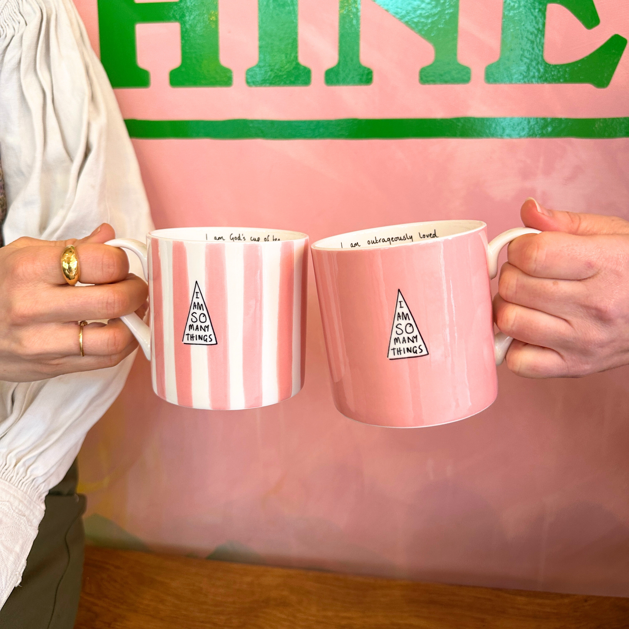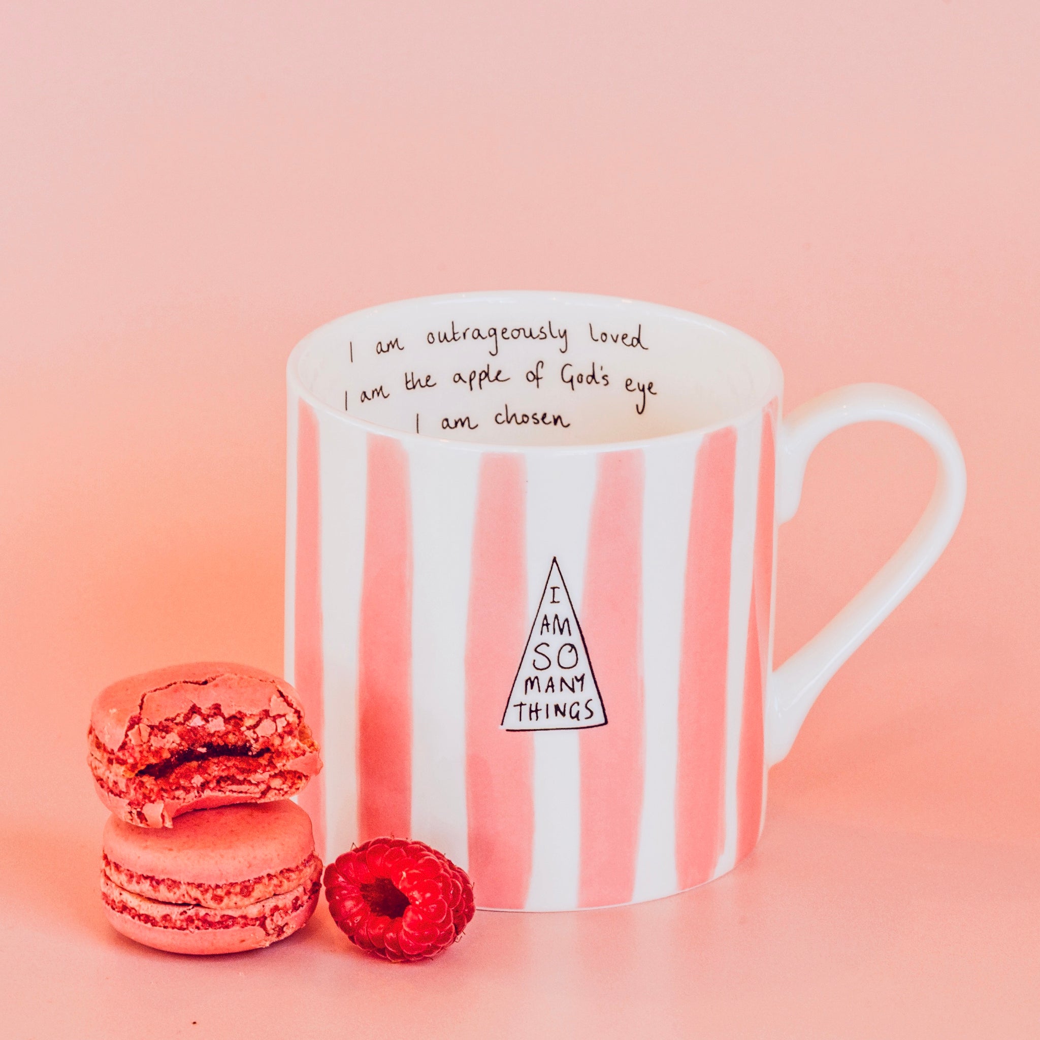 Embrace love and affirmation with every sip from this sophisticated yet playful striped soft pink fine bone china mug. Beautifully crafted to serve as a daily reminder, this mug declares how deeply cherished the drinker is, affirming their true identity as a beloved child of God.